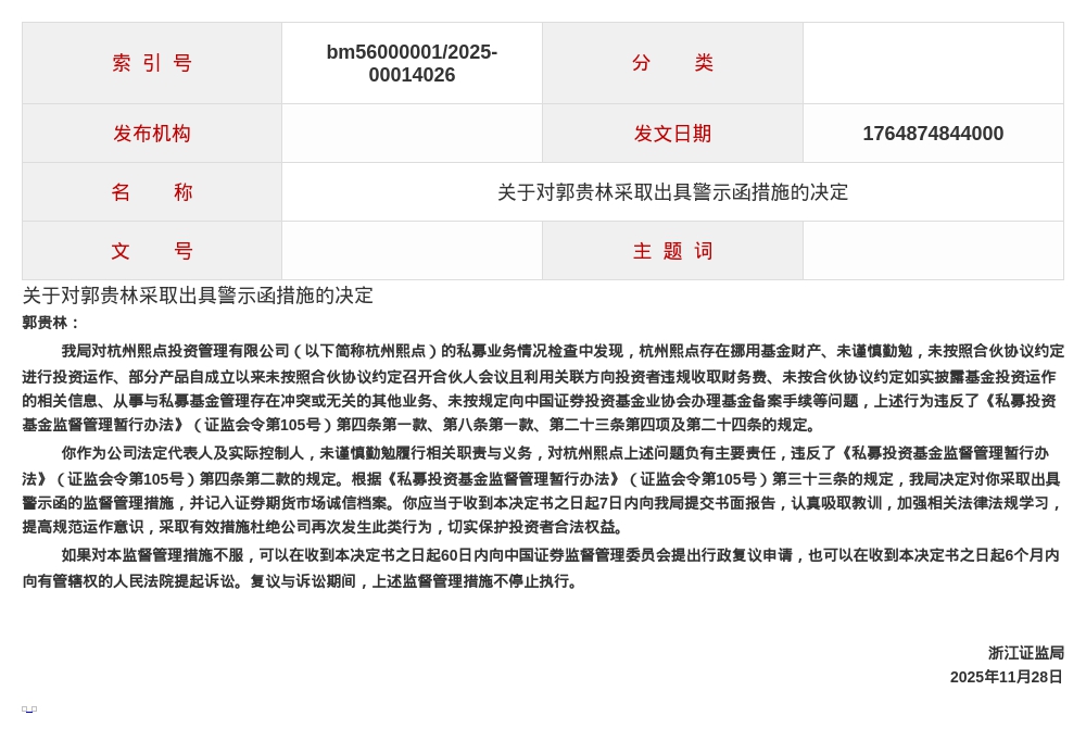 针对以上问题,浙江证监局决定对杭州熙点投资管理有限公司及郭贵林、刘起采取出具警示函的监督管理措施,并记入证券期货市场诚信档案。