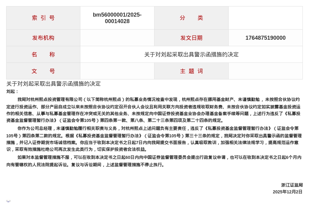 蓝鲸新闻12月5日讯,近日,浙江证监局发布了行政监管措施决定书,剑指杭州熙点投资管理有限公司及其相关责任人。