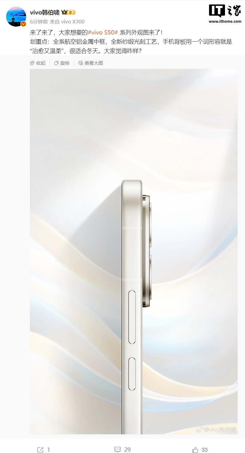 IT之家 12 月 5 日消息,vivo 官方今天在微博正式亮相 S50 系列手机“告白”配色。