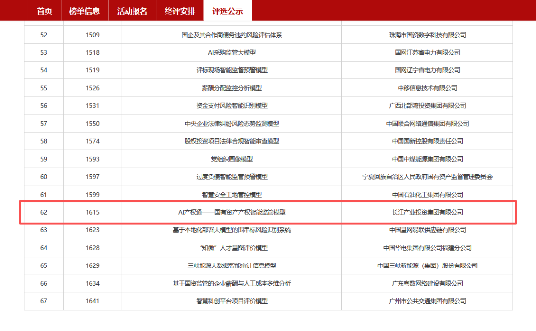 近日,由国务院国资委办公厅主办的“2025年智能监管业务模型创新活动”评选结果正式揭晓。长江产业集团报送的“国有资产产权智能监管模型”(简称“AI产权通”),作为全省唯一一个获得该奖项的项目,从全国245个入围项目中脱颖而出,荣获“优秀成果奖”。