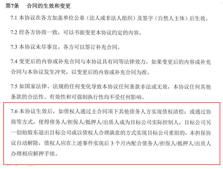 二是合同的生效和变更。该协议第7.6条载明:该担保协议生效后,如债权人通过主合同项下其他债务人方实现债权清偿;或通过协商等方式,使得债务人/担保人/质押人/出质人成为目标公司(指骏玖电子)实际控制人,目标公司另一创始股东退出目标公司或以债权人合理满意的方式实现目标公司重组的,本担保协议自动解除,债权人应在上述事件实现后3个月内配合债务人/担保人/质押人/出质人办理相应解押手续。