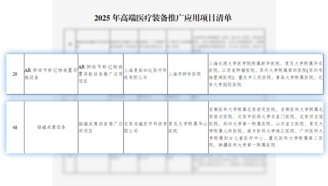 近日,工业和信息化部、国家卫生健康委员会、国家药品监督管理局联合公示发布《2025年高端医疗装备推广应用项目清单》,复星诊疗科技在肿瘤和神经科学领域的两项创新产品——“AR肺结节标记物放置导航设备”和“脑磁成像设备”成功入选。