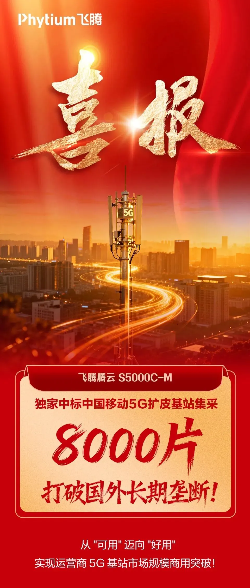飞腾腾云 S5000C-M 独家中标中国移动(600941) 5G 扩皮基站集采 8000 片,打破国外长期垄断。