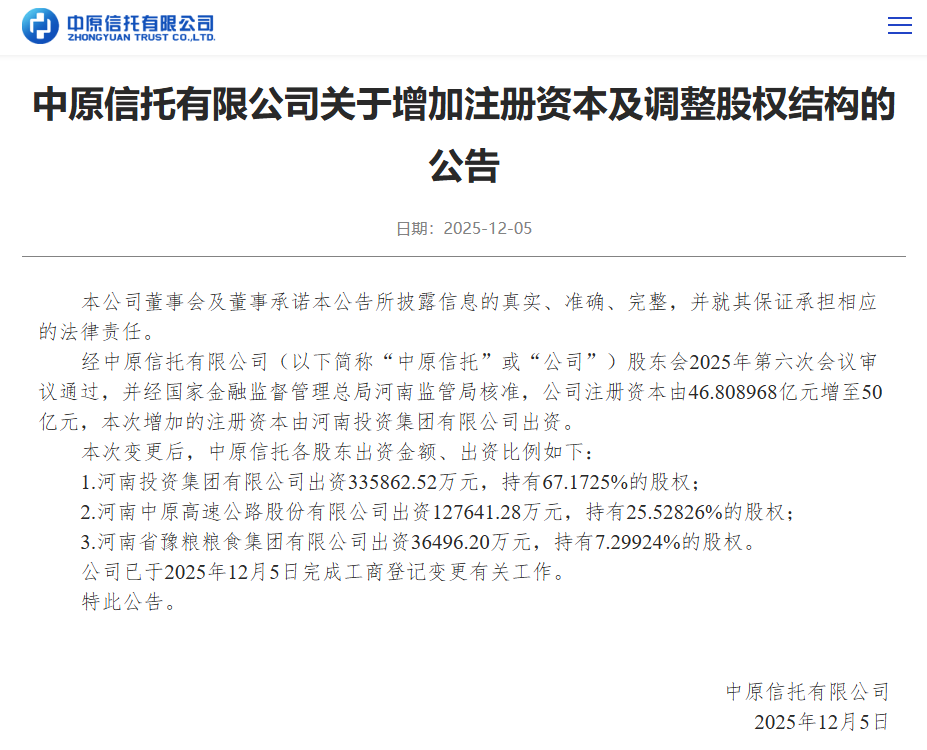 另据中原信托公众号消息,近日公司陆续收到国家金融监督管理总局河南监管局批复和河南省市场监督管理局新营业执照,标志着中原信托2025年增资扩股工作圆满完成。增资后,中原信托注册资本达到50亿元人民币,资本实力和综合竞争力迈上新台阶。