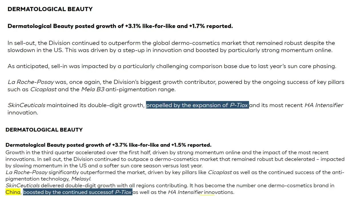 上述源自中国实验室的“风味创新”,连同由中国研发团队主导的修丽可多肽精华液P-TIOX,已成为欧莱雅在其全球第二大市场进行本土深研的代表。尤其是后者,连续出现在欧莱雅集团2025年半年报和前三季财报中,被誉为推动修丽可持续保持两位数增长的头号功臣。