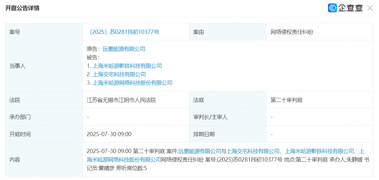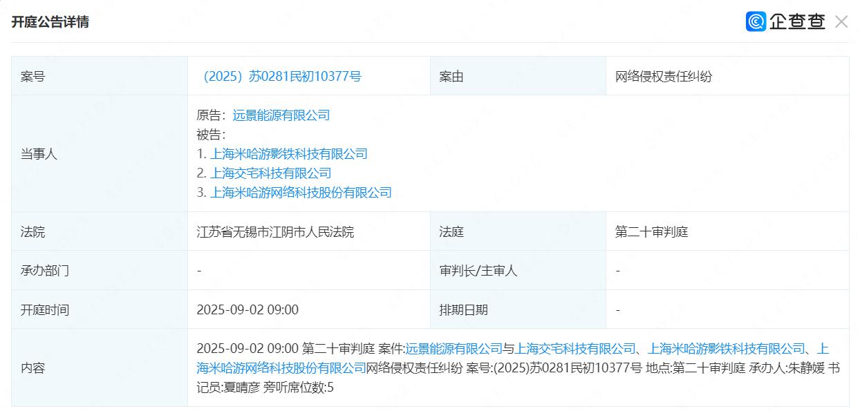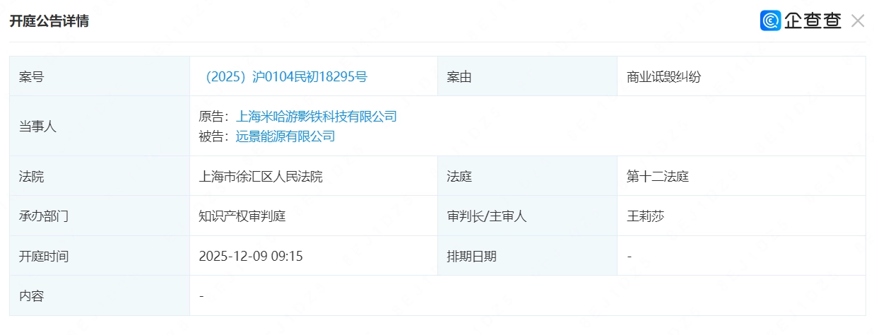 企查查显示,米哈游也反向起诉了远景能源。上海米哈游影铁科技有限公司起诉远景能源有限公司的“商业诋毁纠纷”案将于 12 月 9 日开庭。双方暂未回应相关进展。