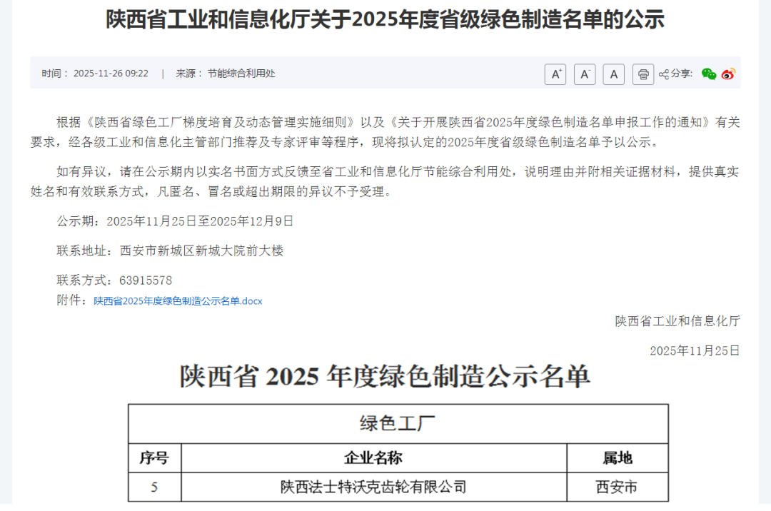 近日,陕西省工业和信息化厅正式公示2025年度省级绿色工厂名单,集团所属陕西法士特沃克齿轮有限公司凭借突出表现成功入选。这一殊荣,标志着沃克公司绿色制造水平获省级权威认可,实现了经济效益与生态效益的协同共进,也是对沃克公司绿色发展成效的有力认证。
