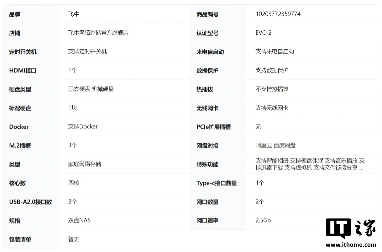 IT之家注意到,该产品已上架京东,价格为占位符,参数表显示配有 3 个 M.2 插槽、四核处理器、1 个 Type-C 接口、2 个 2.5G 网口,标配 1 块硬盘,支持 Docker、无线网卡、来电自启动,不支持热插拔,对接阿里云、百度网盘。