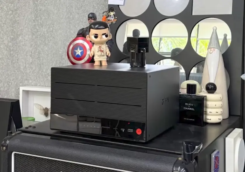 根据朱挺分享的照片,飞牛自研的六盘位 NAS 采用卧式造型,侧面覆盖灰色喷漆并有飞牛 fn 的 Logo,正面则采用黑色面板。NAS 的上半部分采用格栅式设计,留有硬盘观察口;下半部分则为亮面设计,电源按钮以一抹红色点缀,偏右侧还配有 USB-C、USB-A 等接口和 SD 卡插槽。
