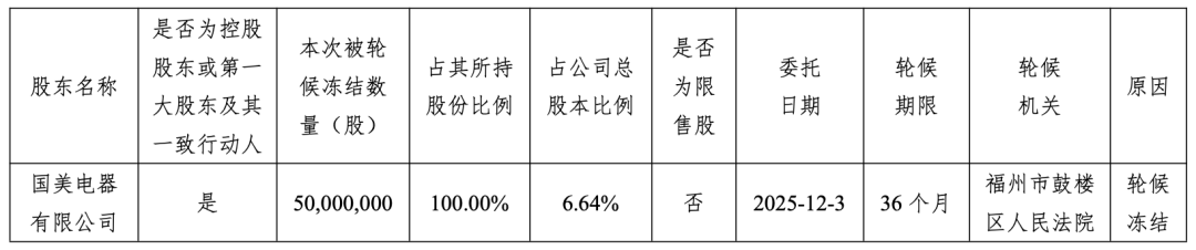 公告显示,此次被轮候冻结的股份数量为5000万股,占其所持股份的100%,占公司总股本的6.64%。轮候期限为36个月,轮候机关为福州市鼓楼区人民法院,冻结原因为轮候冻结。