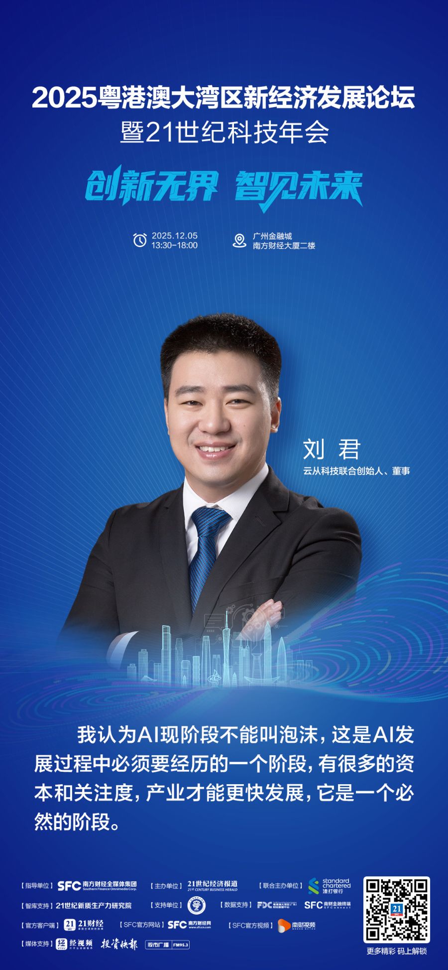 作为“南方财经论坛2025年会”的重要专题会议之一,本届科技年会以“创新无界智见未来”为主题。会上,一场以“AI驱动的新经济图景”为主题的圆桌对话,聚焦AI行业热点。云从科技(688327)联合创始人、董事刘君分享了对AI泡沫、AI应用和未来机遇的见解。