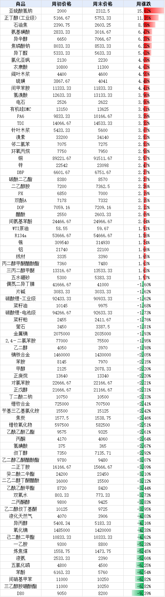 据生意社价格监测,2025年第48周(12.1-12.5)大宗商品价格涨跌榜中环比上升的商品共111种,集中在化工板块(共74种)和钢铁板块(共10种),涨幅在5%以上的商品主要集中在化工板块;涨幅前3的商品分别为亚硫酸氢钠(15.62%)、正丁醇(工业级)(11.35%)、石油焦(8.89%)。