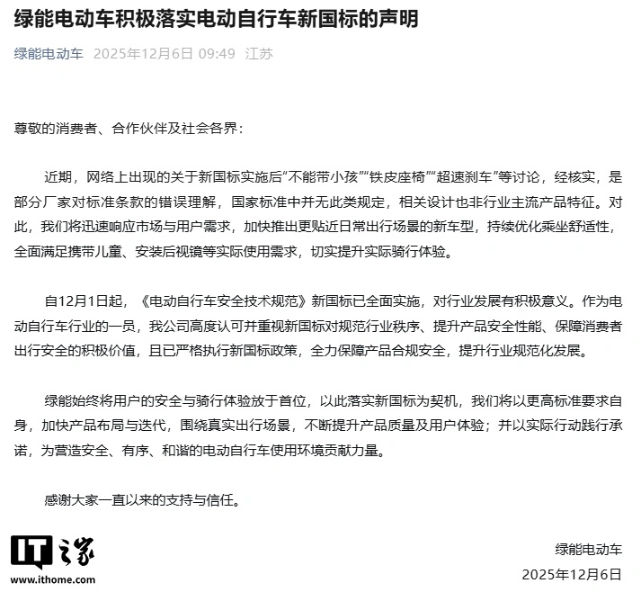 IT之家12月6日消息,绿能电动车今日发布声明称,近期网络上出现的关于新国标实施后“不能带小孩”“铁皮座椅”“超速刹车”等讨论,经核实,是部分厂家对标准条款的错误理解,国家标准中并无此类规定,相关设计也非行业主流产品特征。