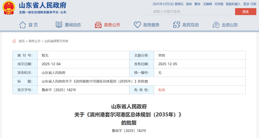 山东省政府网站12月5日发布《山东省人民政府关于〈滨州港套尔河港区总体规划(2035年)〉的批复》。