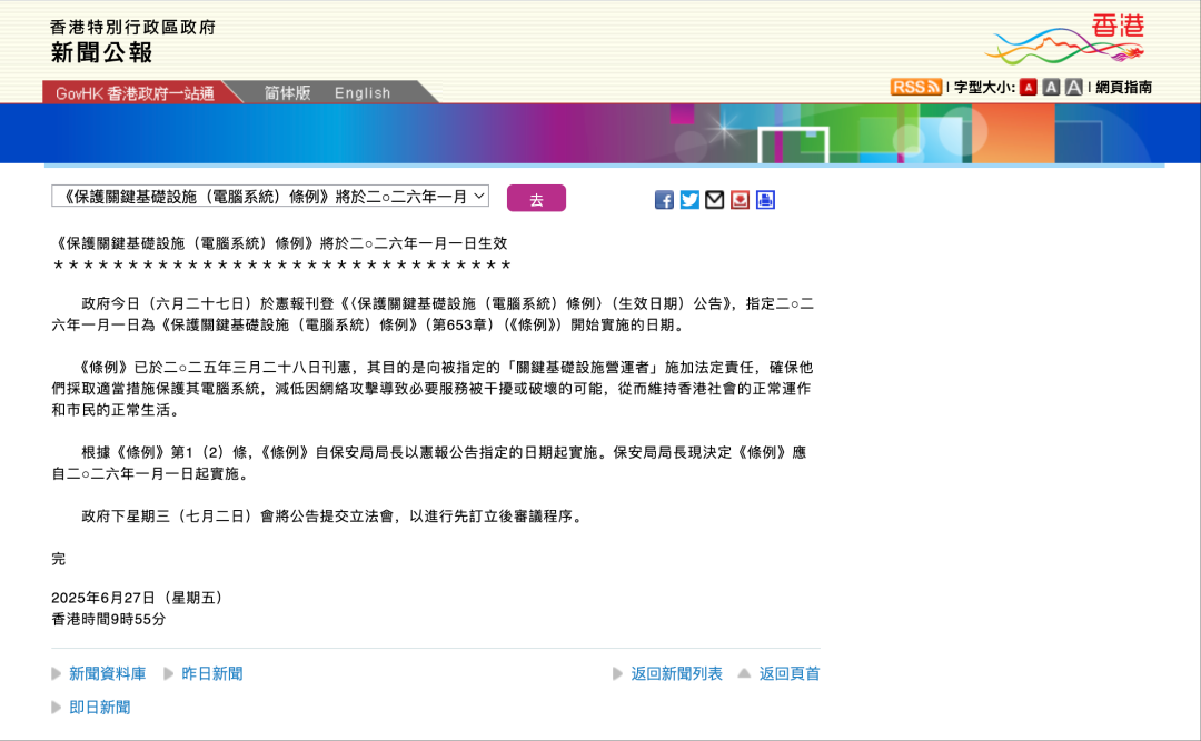 备受关注的香港《保护关键基础设施(电脑系统)条例》将于2026年1月1日正式生效。该《条例》旨在向被指定的“关键基础设施营运者”施加法定责任,确保采取适当措施保护其计算机系统,降低因网络攻击导致的重要服务中断或受损风险,提升关键基础设施计算机系统的安全水平,从而加强香港整体的数字安全韧性。