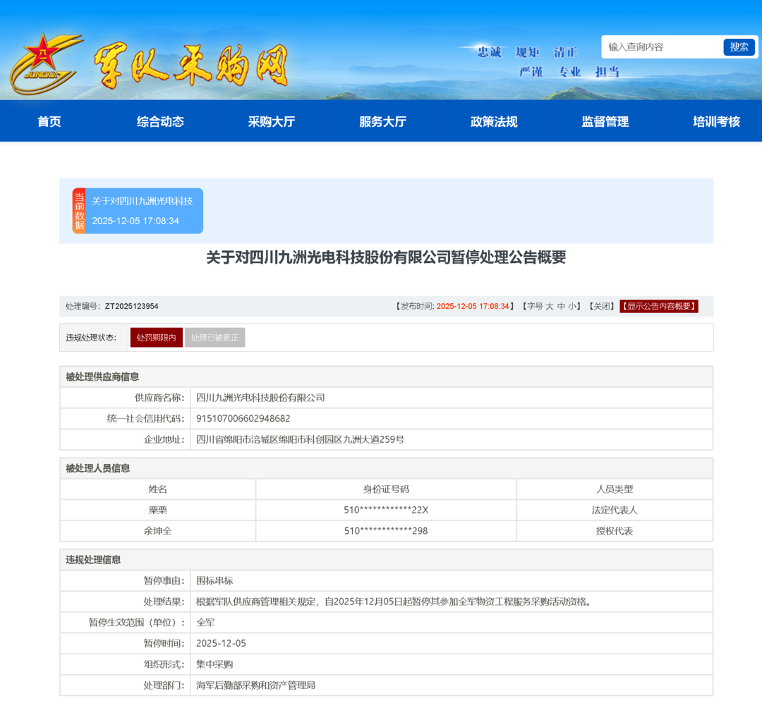 近日,军队采购网发布关于对四川九洲(000801)光电科技股份有限公司暂停处理公告。