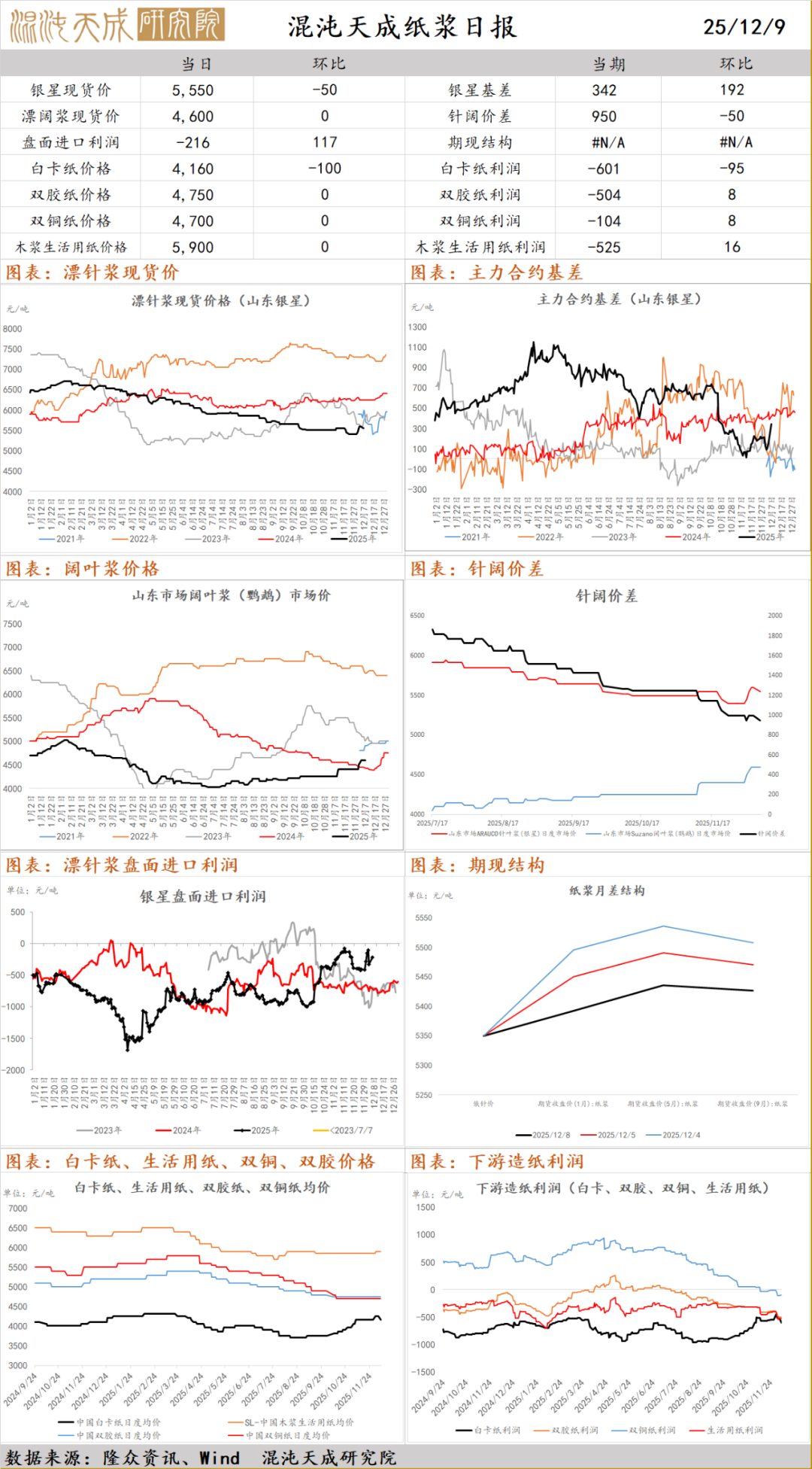 纸浆:昨日国内针叶浆现货小幅下跌,银星5550元/吨(-50),俄针5350元/吨(-50);阔叶浆现货稳定,金鱼4600元/吨(0);针阔叶浆价差950元/吨(-50),纸浆市场整体呈现交投清淡、价格持稳;白卡纸市场价格稳中回调100元/吨,因为纸厂涨幅收窄,贸易商高价回调100元/吨;生活用纸市场价格区间盘整,市场交投活跃度变化不大,业者多持观望态度;文化用纸市场当前行业产能基数庞大,虽工厂开工水平偏低,但行业整体供应仍显充裕;昨日冲高回落,近年针叶浆整体产能扩张有限,持续低价导致上游高成本浆厂出现停产、关闭产能等情况,下方5000元/吨成本支撑明显,同时交割品取消部分俄针品牌,对远月估值也有利多,国内纸厂整体维持刚需购买,在国内春节旺季结束前,可以考虑回调逢低买入。