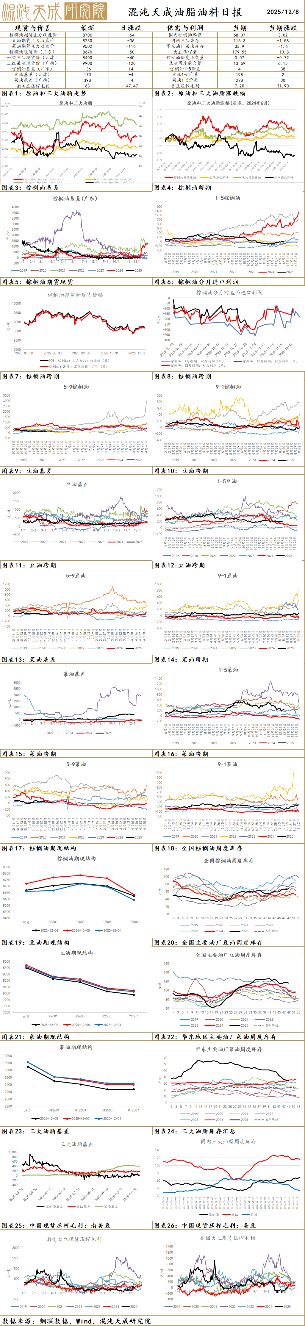 供给端:据MPOA发布数据,马来西亚11月1-30日棕榈油产量预估减少4.38%;11月泰国南部遭遇数十年来最严重洪灾,部分地区水位高达3米,洪水扰乱了泰国南部受灾地区的棕榈果采收和运输活动,若积水持续可能造成局部作物损失,给产量带来下行风险;印度尼西亚棕榈油协会GAPKI周一表示,苏门答腊岛的毁灭性洪水尚未对棕榈油生产造成重大影响,GAPKI秘书长哈迪·苏庚表示,受洪水和滑坡影响的地区大多是住宅区,而不是棕榈油种植园,他补充说:“我们的会员目前还没有接到投诉。到目前为止,他们报告说一切正常。”;SGS公布数据显示,预计马来西亚11月1-30日棕榈油出口量为779392吨,较上月同期出口的1282036吨减少39.21%;南部半岛棕榈油压榨商协会(SPPOMA)数据显示,2025年11月1-30日马来西亚棕榈油单产环比上月同期减少2.09%,出油率环比上月同期增加0.36%,产量环比上月同期减少0.19%;船运调查机构ITS:马来西亚11月棕榈油出口量预计为1316455吨,下降19.7%;印尼棕榈油协会(GAPKI)发布的数据显示,印尼9月出口了220万吨棕榈油,低于去年同期的226万吨,亦低于今年8月所出口的348万吨;9月印尼毛棕榈油产量393万吨,印尼9月期末库存259.2万吨,高于8月的254.3万吨,增幅1.93%;印尼政府正在考虑从明年起建立总计60万公顷(约148万英亩)的新棕榈油种植园,以提高产量;马来西亚贸易和行业官员:在有利的天气条件、改善的劳动力供应以及高产量的新种植园的支持下,马来西亚的毛棕榈油产量预计将在2025年首次超过2000万吨,同比增长3.4%;受有利天气影响,GAPKI预计印尼2025年棕榈油产量将增长10%;印尼林业小组计划从9月1日起,对约427万公顷(1.055万英亩)林区内未获得许可运营的矿山进行打击,工作小组已经于3月启动了所谓的“纪律行动”,打击非法棕榈油生产,并派遣军方人员接管了逾330万公顷种植园。