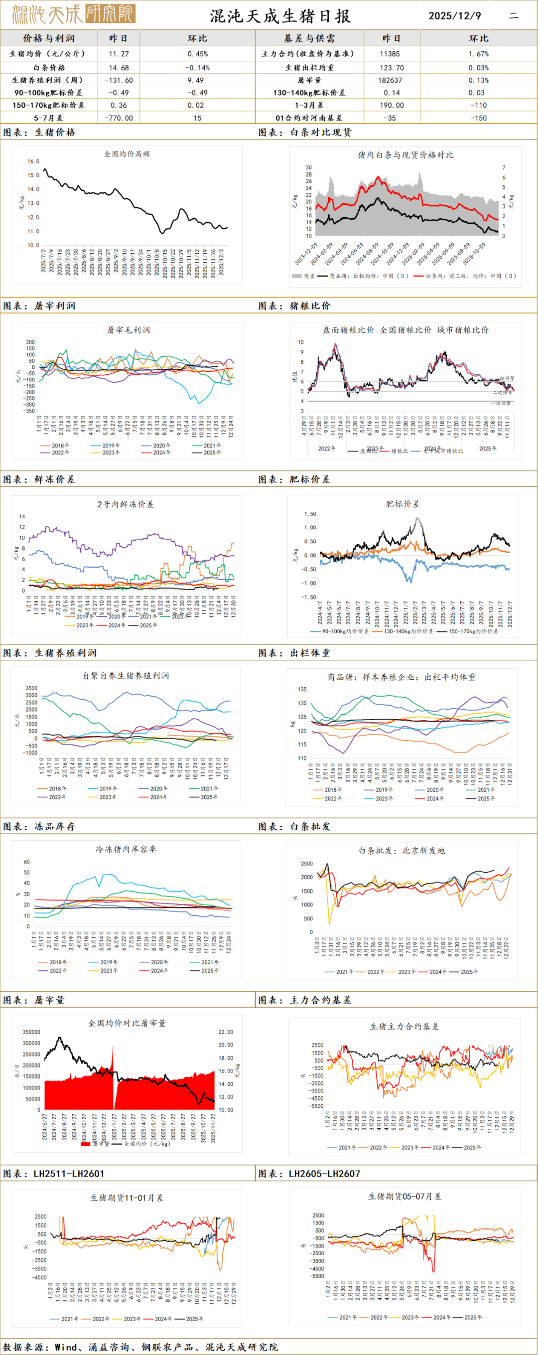 1.机构消息:北方市场屠宰企业采购相对顺畅,计划完成度较高;南方市场因腌腊等季节性消费稍有好转,屠企压价难度有增强;整体来看,明日市场价格或小幅变动为主,暂无明显调整预期。(涌益咨询)