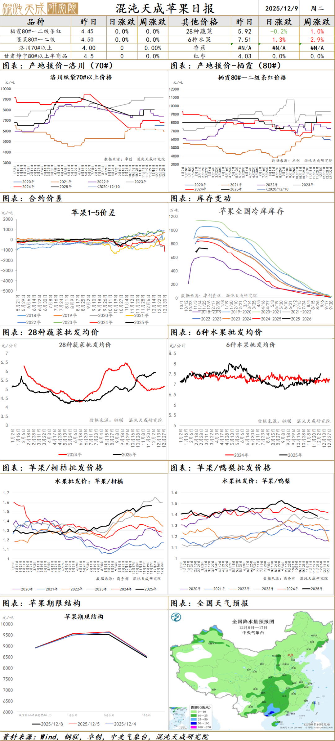 苹果:山东产区库存苹果晚熟纸袋富士主流价格稳定,冷库主要成交中小果及少量统货,大果规格成交比较少,近几日成交量均不大,其他品种电商需求比较多,栖霞地区纸袋富士65#-70#主流2.0-2.2元/斤;陕西产区主流价格稳定,贸易商多自己包装自有货源发市场,冷库少量交易东北客商采购大果为主,洛川产区冷库纸袋富士70#起步主流价格3.8-4.2元/斤,好货4.5-5.0元/斤,以质论价;供应端交易进入尾声,需求端表现弱于去年同期,交割上存在反复,短期博弈较强,维持高位震荡,近期主要关注消费端表现。
