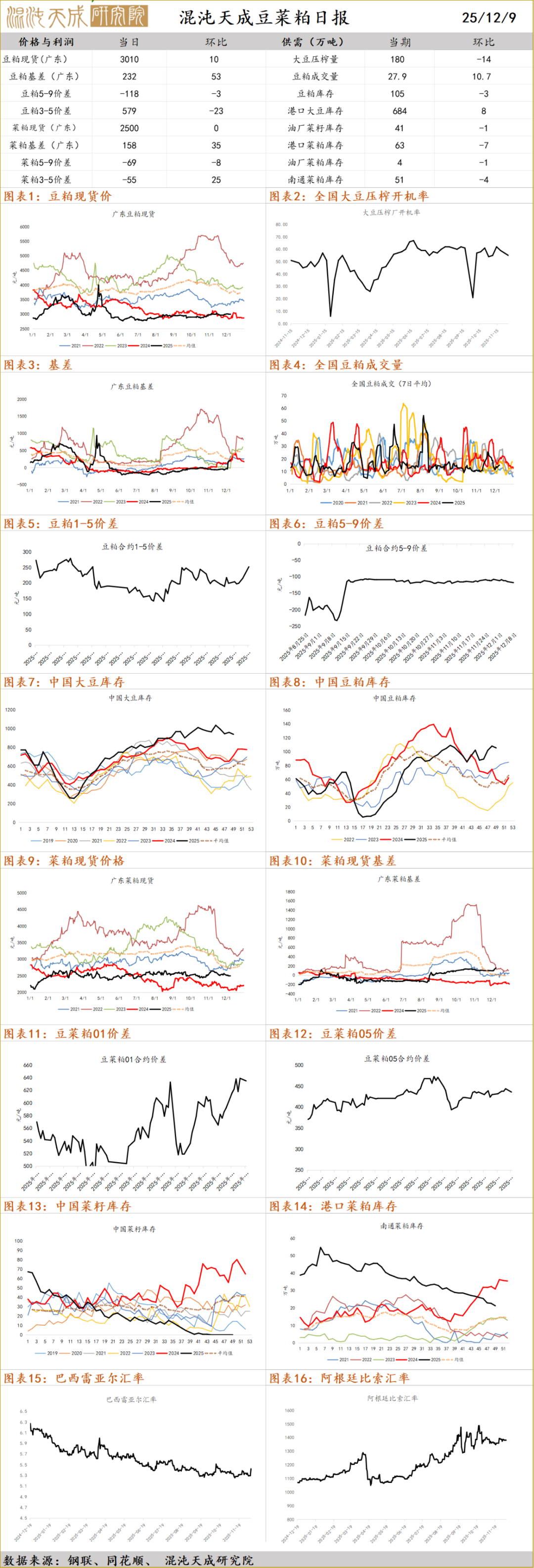 供给端:根据国家粮食交易中心公告,12月11日即将拍卖51.25万吨进口大豆,市场预期将每周拍卖30-50万吨,拍卖总量400万吨左右;Patria报告称巴西大豆播种面积预计将触及4858万公顷(1.20亿英亩),较前一次预估增加0.9%,且高于之前一年的4769万公顷,Patria表示,播种面积将创下近几十年来最低的同比百分比增幅;据巴西农业部下属的国家商品供应公司CONAB,截至11月29日,巴西大豆播种率为86%,上周为78%,去年同期为90%,五年均值为84.4%;美农11月USDA报告显示,2025年美国大豆单产预计为每英亩53蒲,大豆产量预期为42.53亿蒲,单产和产量均有小幅下调;中国表示将恢复三家美国公司对华出口大豆的资格,中国已同意在未来三年内每年至少购买2500万吨大豆,本季购买1200万吨大豆;11月全国主要油厂大豆压榨量在900万吨左右,月环比增加40万吨,同比增加80万吨,较过去三年同期均值增加120万吨,12月我国进口大豆到港量或小幅下降,但当前油厂开机率保持高位,预计全月国内主要油厂大豆压榨量在860万吨左右,同比增加约40万吨,较过去三年同期均值增加约30万吨。