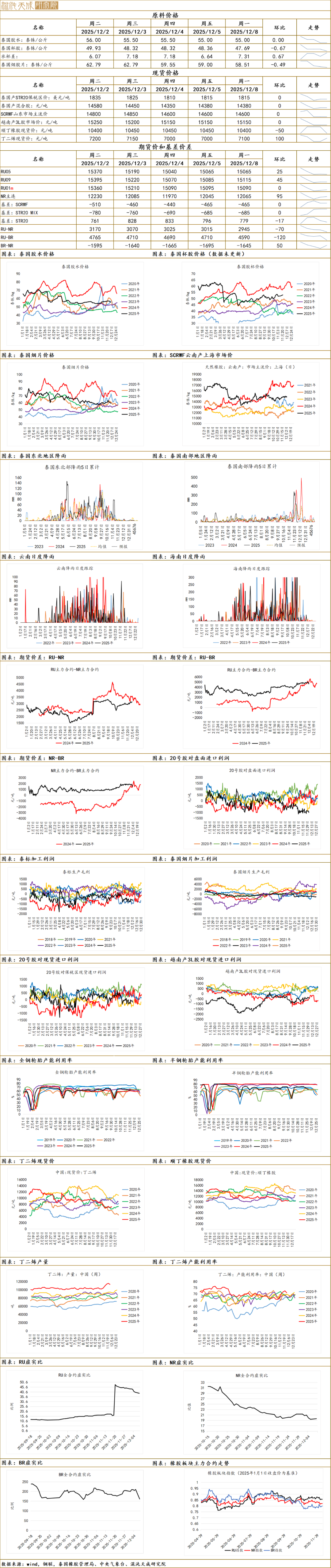 1.机构消息:据隆众资讯统计,截至2025年12月7日,青岛地区天胶保税和一般贸易合计库存量48.87万吨,环比上期增加0.72万吨,增幅1.49%。保税区库存7.39万吨,增幅2.08%;一般贸易库存41.48万吨,增幅1.38%。青岛天然橡胶样本保税仓库入库率增加0.79个百分点,出库率减少0.60个百分点;一般贸易仓库入库率减少0.72个百分点,出库率增加1.02个百分点。(隆众资讯)