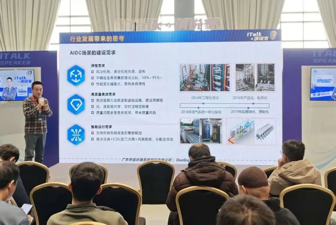 在大会iTalk演讲环节中,申菱液冷系统架构部总监孙地发表了题为《全预制大液冷系统:AIDC建设新模式》的主题演讲。他直指AIDC建设“算力强、空间紧、工期短”的核心矛盾,系统性地分享了对应的全预制化液冷解决方案。