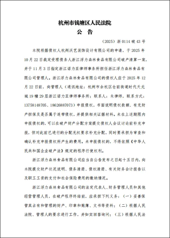 根据公告,杭州市钱塘区人民法院已于2025年10月22日裁定受理浙江浮力森林食品有限公司破产清算案。债权人需在12月22日前向管理人申报债权。这家曾是杭州本土烘焙标杆的品牌,最终走完了从快速崛起、资本高光到扩张受挫、信任崩塌的全过程。