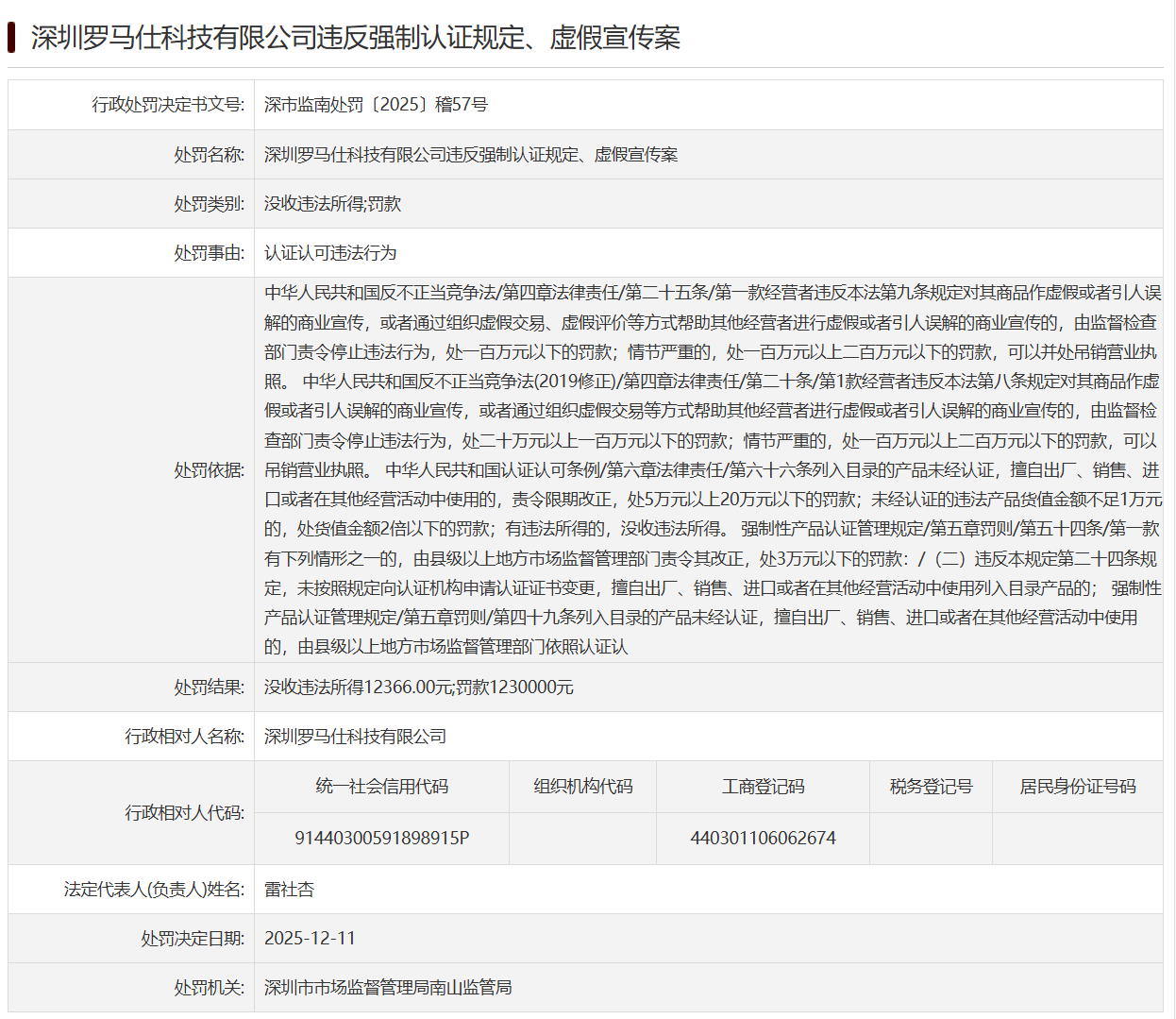 深圳市市场监督管理局网站显示,近日,深圳罗马仕科技有限公司因违反强制认证规定、虚假宣传案,被深圳市市场监督管理局南山监管局没收违法所得1.2万余元、罚款123万元。