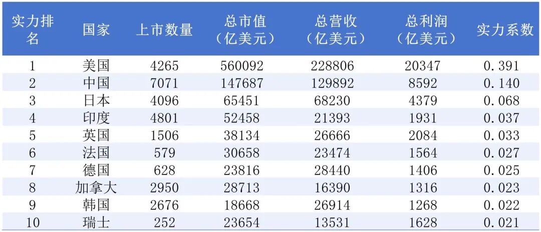 分两个层面来看,一是空间分布。中国上市公司数量达到7071家,在所有国家中位居首位,印度、美国、日本、加拿大分列2至5位。但从上市公司实力(主要综合公司的市值、营收和利润等指标)来看,美国则具有绝对优势,中国、日本、印度、英国则紧跟其后。