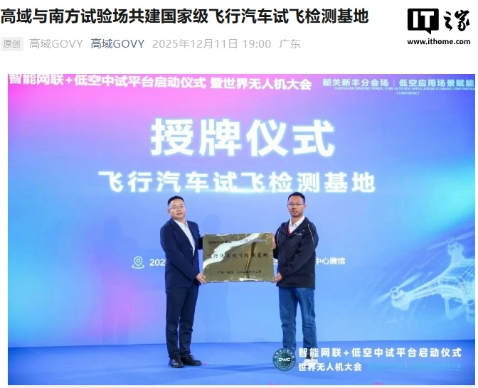 IT之家12月14日消息,据广汽高域官方公众号,在12月11日举行的2025世界无人机大会上,中国低空经济领域迎来里程碑式突破——高域与南方试验场在韶关市新丰县合作建设的“飞行汽车试飞检测基地”(以下简称“基地”)正式授牌。