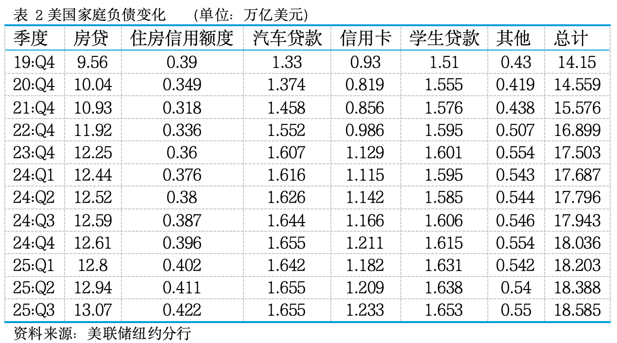 美国家庭总负债已处于历史最高水平,物价水平可谓压力三大。据美联储发布的《2025年第三季度家庭债务与信用报告》,2025年第三季度家庭新增债务1970亿美元,总债务水平达到18.59万亿美元,其中房贷负债占13.07万亿美元。自2019年年末以来,家庭负债增加了4.44万亿美元,其中住房抵押贷款就增加了3.51万亿美元,汽车贷款和信用卡贷款分别增加了3250亿、3030亿美元。美联储连续三次降息对中长期利率影响较小,家庭贷款利率依然偏高,经济压力始终存在。