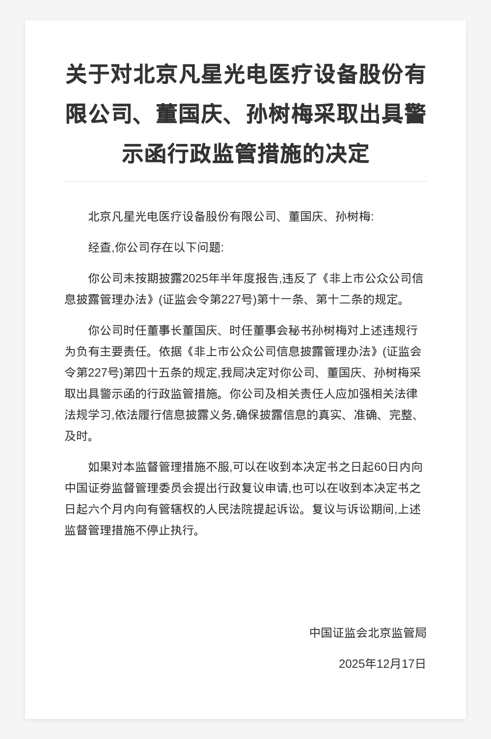对此,中国证监会北京监管局决定对北京凡星光电医疗设备股份有限公司、董国庆、孙树梅采取出具警示函的行政监管措施。