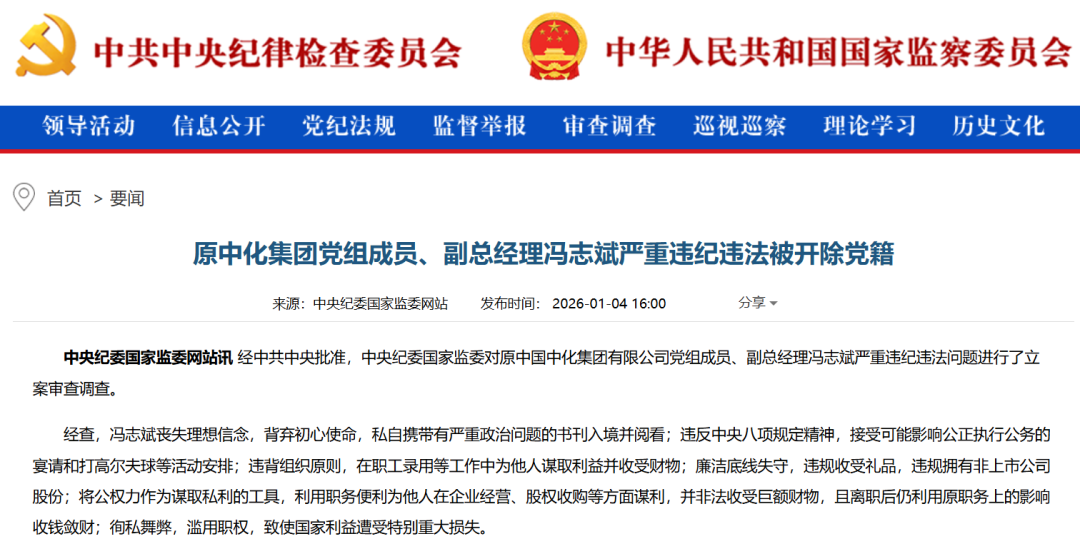 2025年7月,中纪委官网通报称,原中国中化集团有限公司党组成员、副总经理冯志斌涉嫌严重违纪违法,接受中央纪委国家监委纪律审查和监察调查。