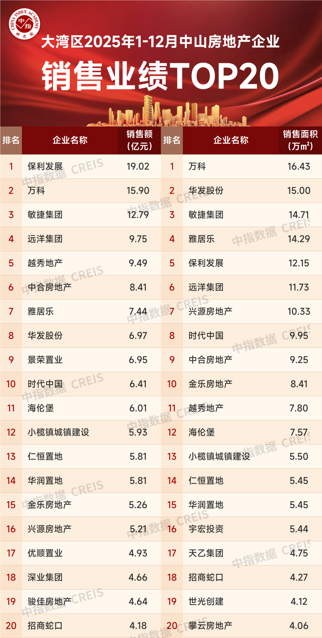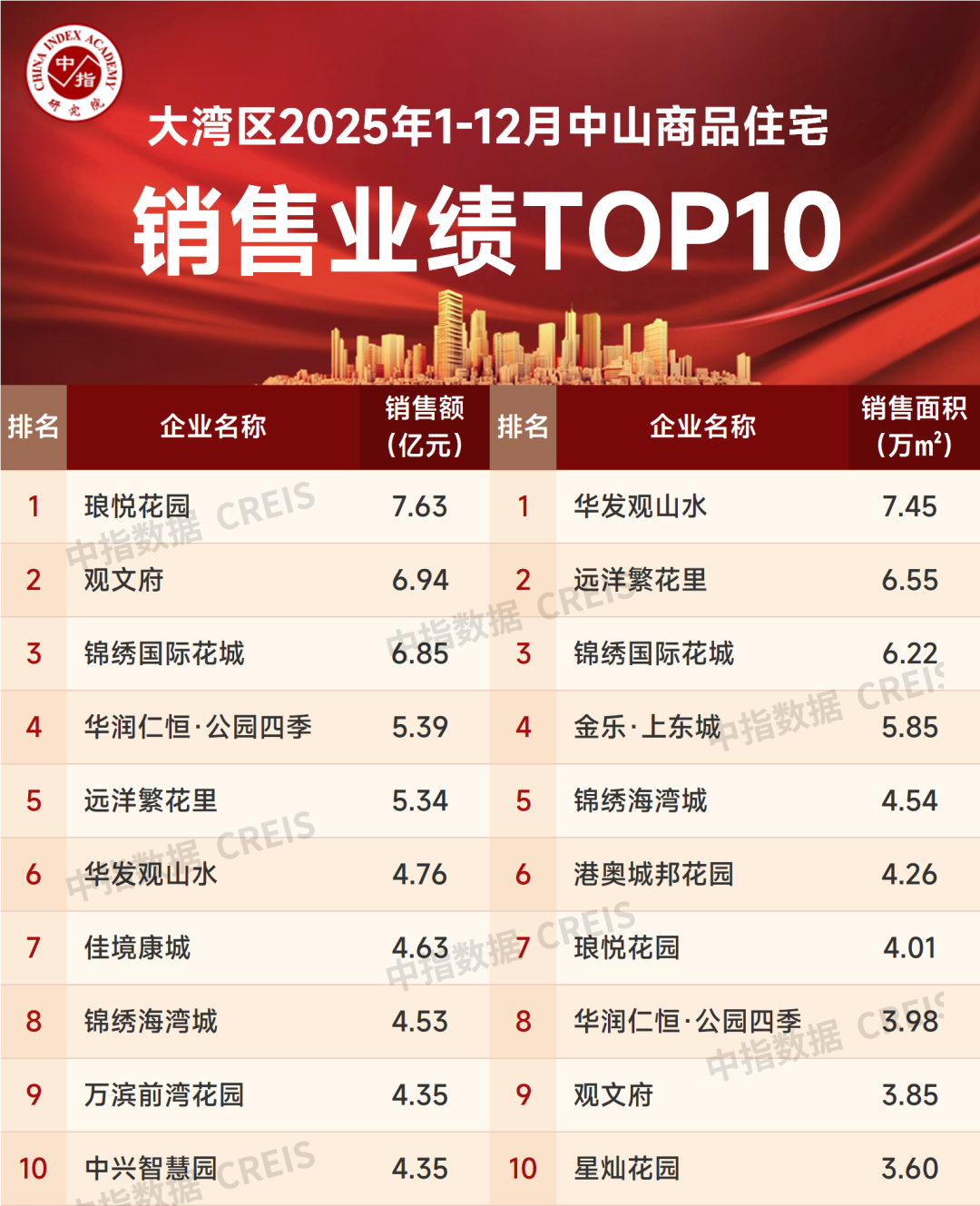 特别声明:房地产企业销售数据统计是以2025年1月1日—12月28日期间销售的商品房为统计口径,主要依据在中山市的销售监测数据,对于监测不全的项目数据,由企业提供相关文件并严格审核,也纳入统计范围。本报告仅供参考,我方不对使用报告及其内容所引发的任何直接或间接损失承担责任。
