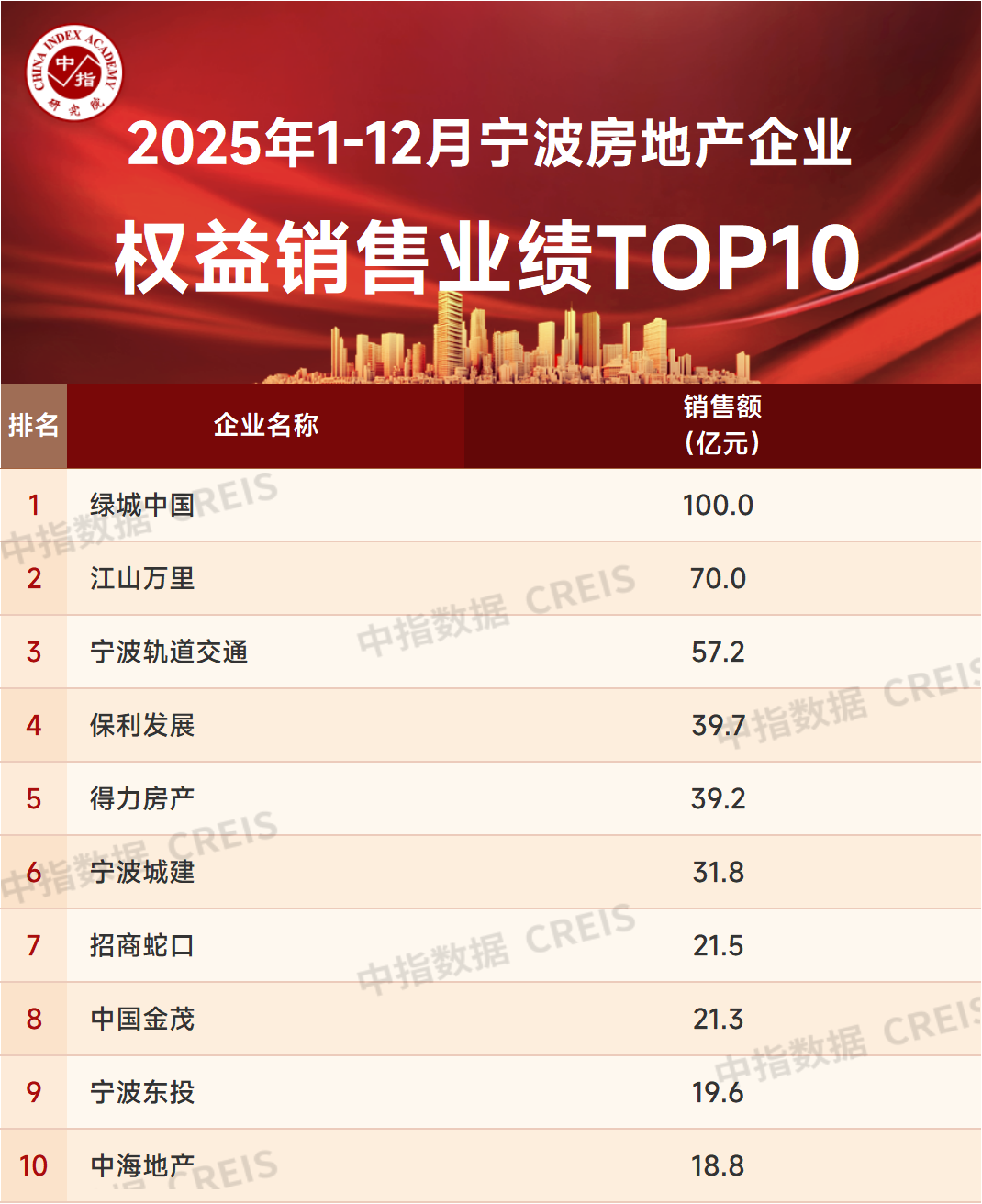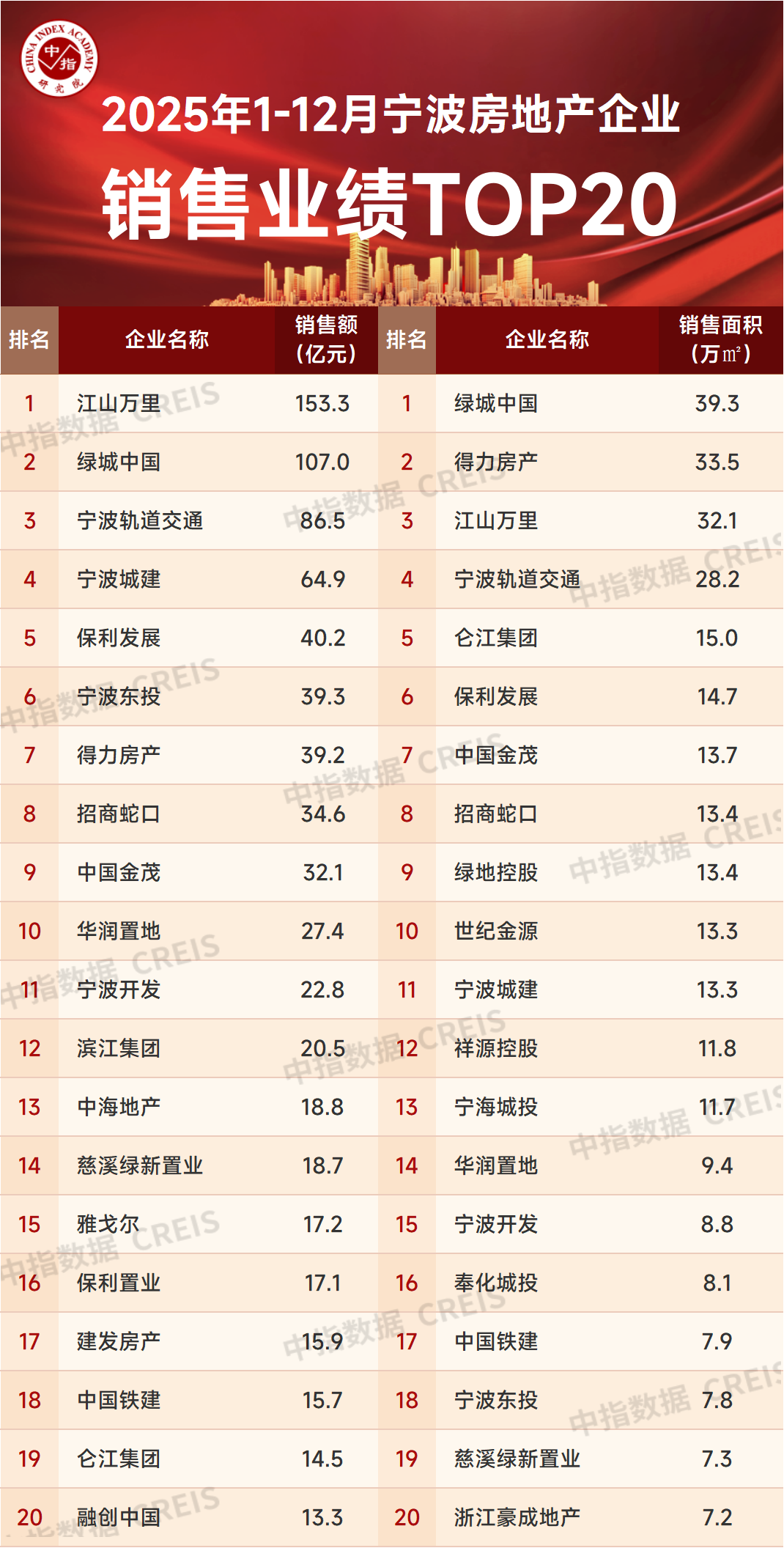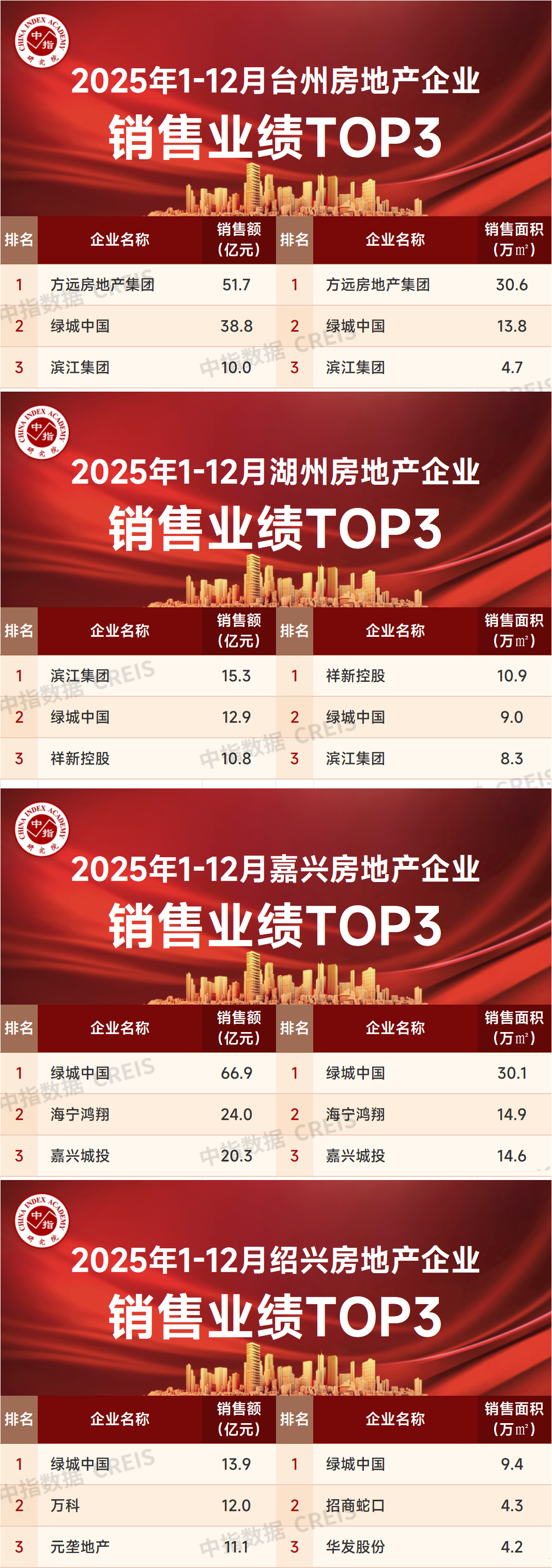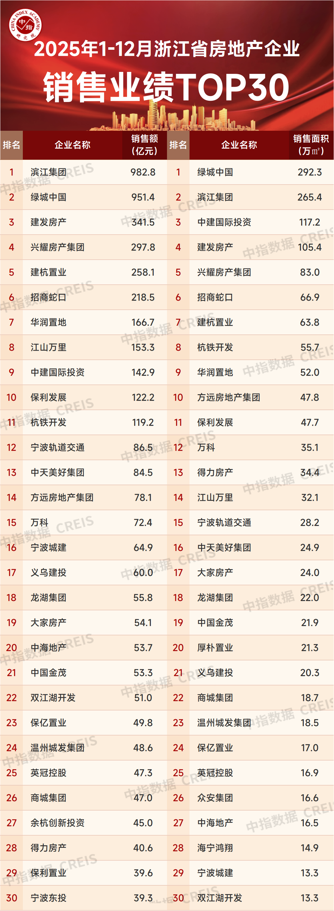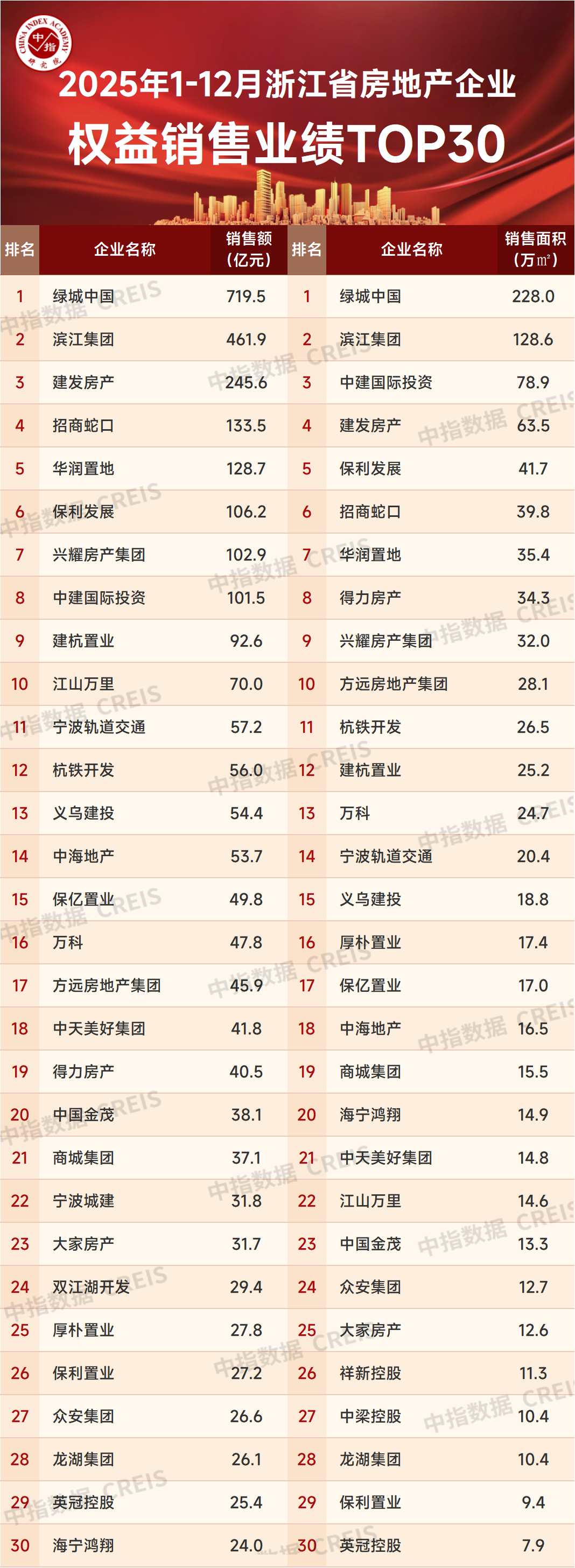 特别声明:浙江省房地产企业销售数据统计是以2025年1月1日-12月31日期间销售的并表商品房为统计口径,包括商品住宅、写字楼、公寓、商业全口径,主要依据CREIS中指数据在浙江省范围的销售监测数据,并参考当期总体经营情况和推盘去化情况进行分析统计;对于少数没有在监测范围内的项目,由企业提供相关文件,经审核,也纳入统计范围。本报告仅供参考,不对使用报告及其内容所引发的任何直接或间接损失承担责任。
