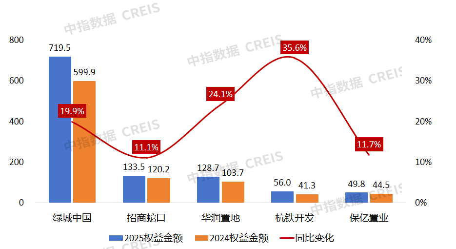 值得关注的是,两大巨头的业绩差距持续收窄,从2024年的73.5亿元大幅缩至2025年的不足32亿元,竞争态势愈发激烈。而在权益维度,绿城展现出压倒性优势,以719.5亿元蝉联浙江权益榜首,同比增幅高达19.9%,增量超200亿元,实现了权益规模的跨越式突破。