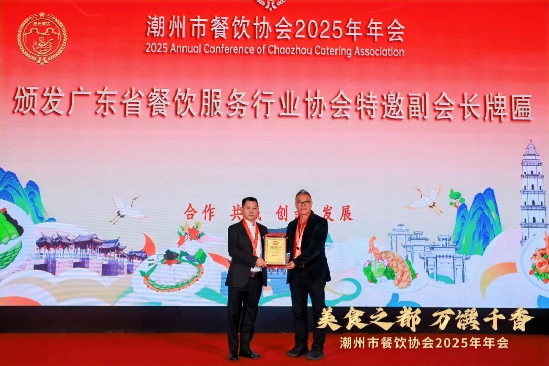 广东省餐饮服务行业协会执行会长谭海城为潮州市餐饮协会林奕强会长颁发省餐协特邀副会长牌匾