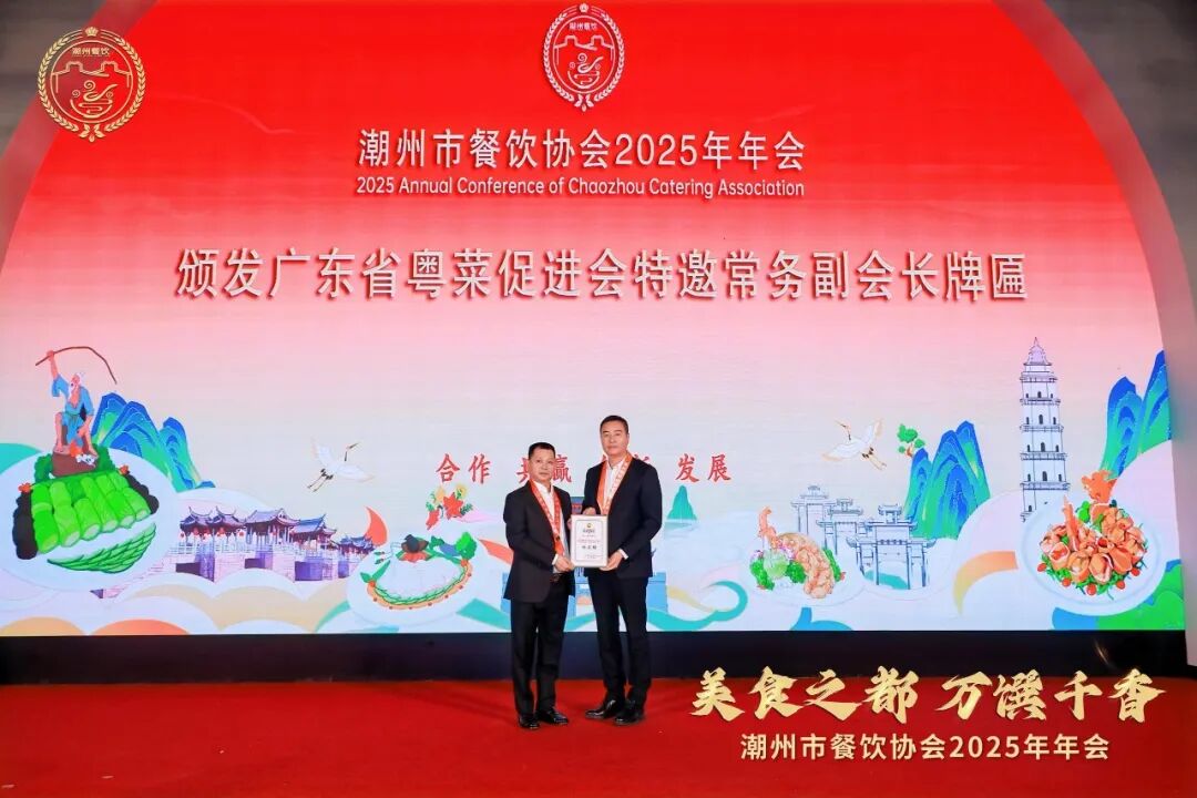 广东省粤菜产业发展促进会会长王杰忠为潮州市餐饮协会林奕强会长颁发省粤菜促进会特邀常务副会长牌匾