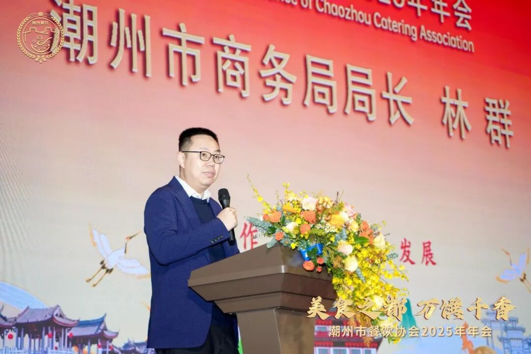 潮州市商务局党组书记局长林群上台致辞。他表示:今天既是一次行业交流的盛会,更是一次文化传承的盛典。我们期待通过这个平台,让全国餐饮界的朋友深度体验潮州菜的独特魅力,推动潮州菜与各大菜系的创新融合;更期待各位嘉宾为潮州菜产业链发展把脉问诊,在标准制定、人才培养、文旅融合等方面深化合作。