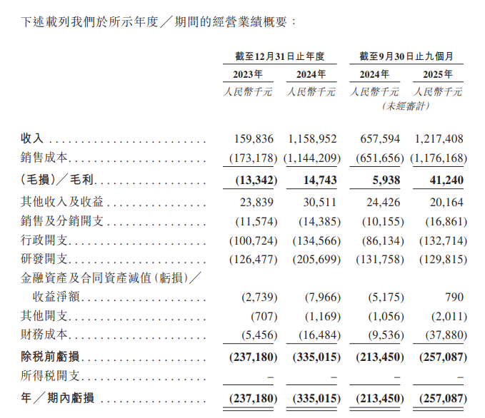 财务表现方面,尽管公司营业收入实现跨越式增长,但公布的净利润一直处于亏损状态。2023年、2024年及2025年1月—9月,公司收入分别为1.60亿元、11.59亿元、12.17亿元;同期亏损分别为2.37亿元、3.35亿元、2.57亿元。