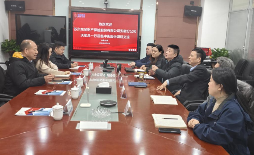 1月4日,苏州东吴财产保险股份有限公司安徽分公司总经理沃军一行到中衡保险公估股份有限公司参观交流。中衡股份董事长杜佐岭,党支部书记、副总裁周婷婷等人热情接待,双方围绕科技赋能应用、业务合作拓展等展开深入沟通。