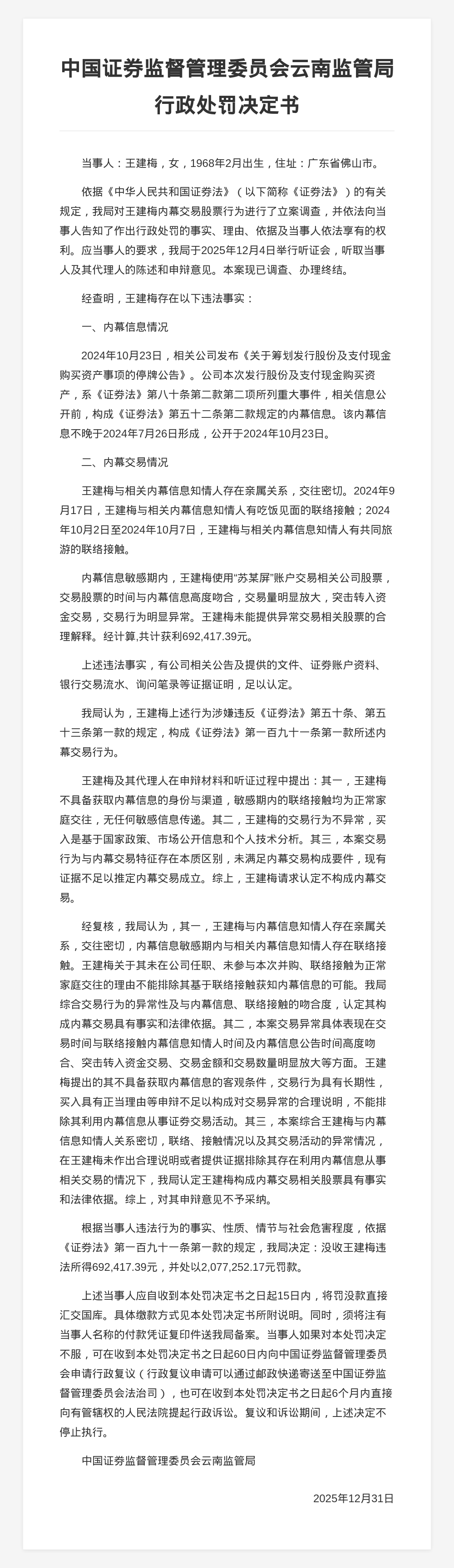 王建梅内幕交易被罚207.72万,获利69.24万被没收