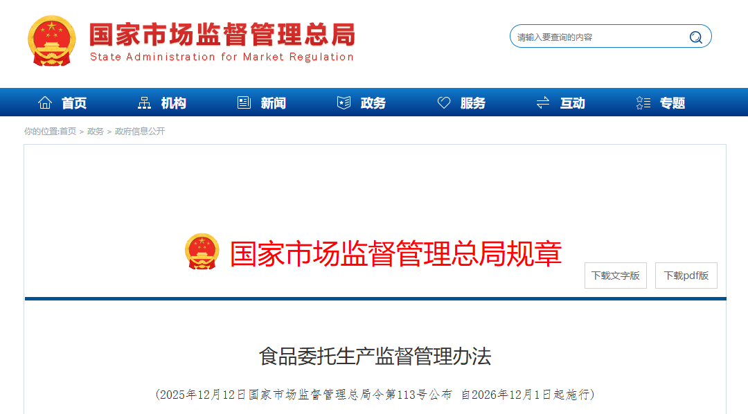 近日,市场监管总局制定出台《食品委托生产监督管理办法》(国家市场监督管理总局令第113号,自2026年12月1日起施行),进一步压实委托双方责任,规范食品委托生产行为,着力防范食品安全风险。