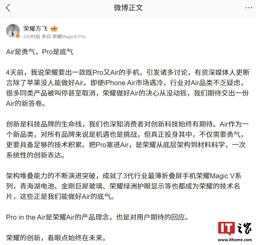 IT之家注意到,方飞今日在微博继续预热这款既 Pro 又 Air 的手机,她表示:“Air 是勇气,Pro 是底气。”
