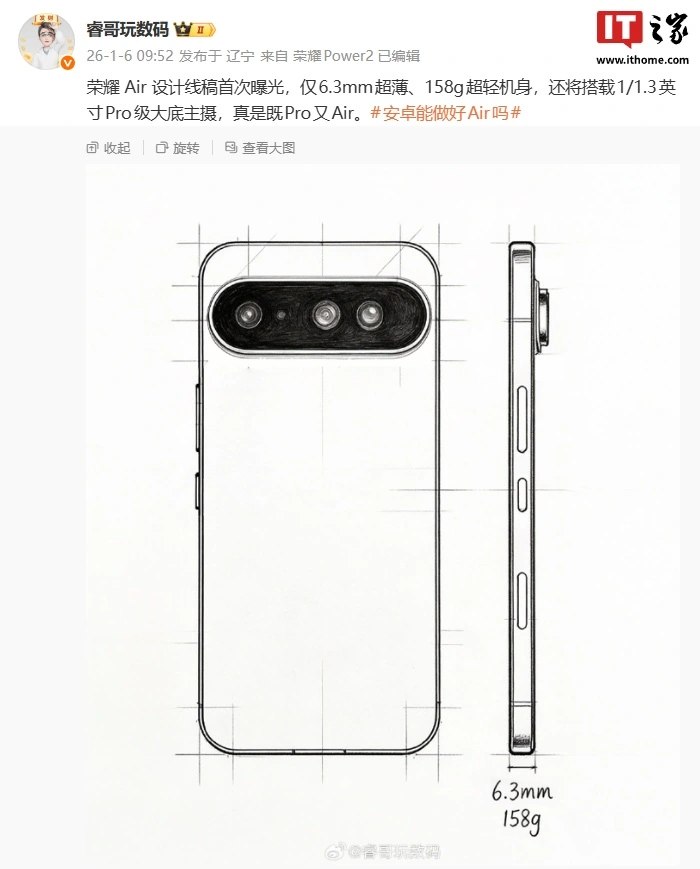 据IT之家昨日报道,荣耀“既 Pro 又 Air”新机设计线稿已曝光,消息称新机厚度仅 6.3mm、拥有 158g 超轻机身,还将搭载 1/1.3 英寸 Pro 级大底主摄。