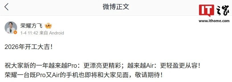 IT之家 1 月 7 日消息,本月早些时候( 1 月 4 日上午),荣耀终端股份有限公司产品线总裁方飞在祝福大家 2026 年开工大吉的同时,也宣布荣耀一台既 Pro 又 Air 的手机也即将和大家见面。