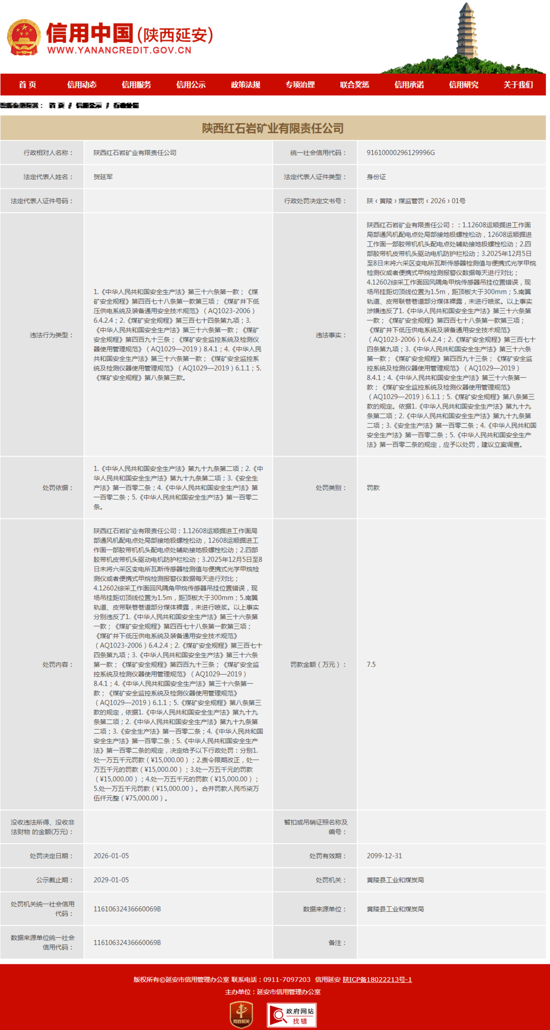 齐鲁晚报·齐鲁壹点记者于信用中国(陕西延安)行政处罚栏获悉,1月5日,延安能源化工集团旗下的陕西红石岩矿业有限责任公司(下称“陕西红石岩矿业”)收到罚单,处罚机关为黄陵县工业和煤炭局。