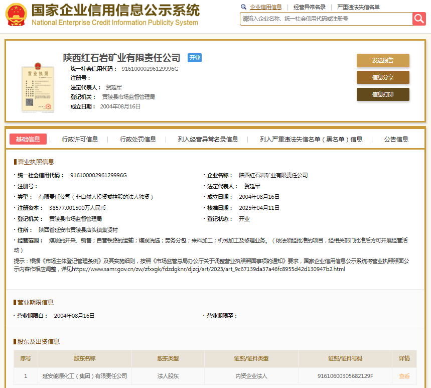 国家企业信用信息公示系统显示,陕西红石岩矿业有限责任公司成立于2004年,注册资本38577.0015万元人民币,法定代表人贺延军,由延安能源化工(集团)有限责任公司全资持股。