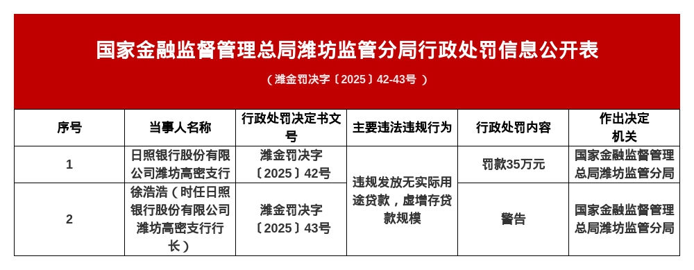 针对上述违法违规行为,国家金融监督管理总局潍坊监管分局对其罚款35万元;对时任日照银行股份有限公司潍坊高密支行行长徐浩浩警告。